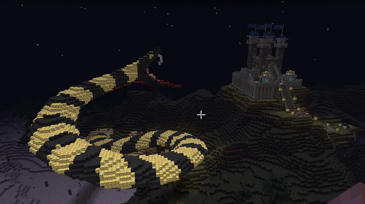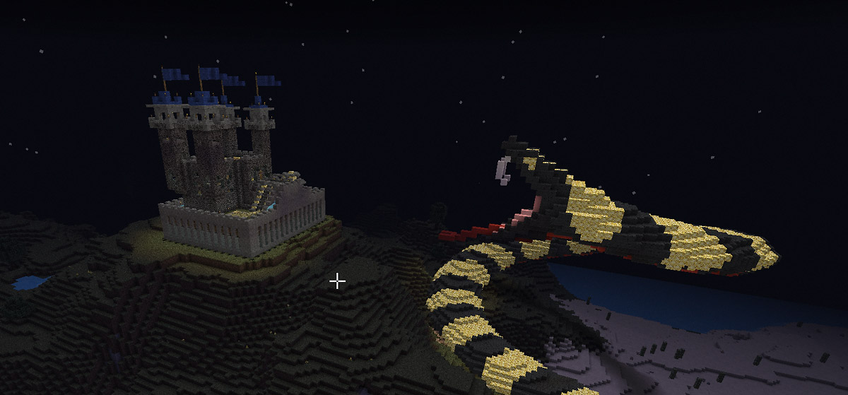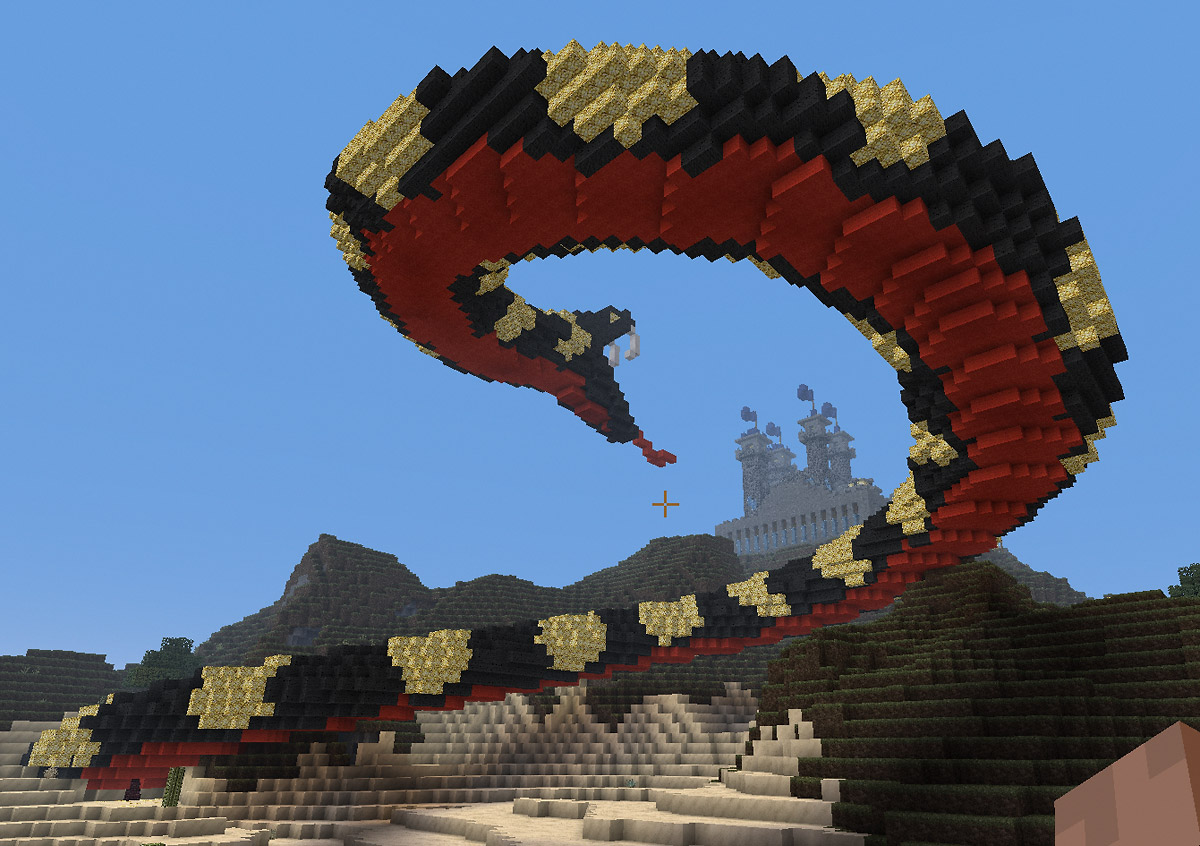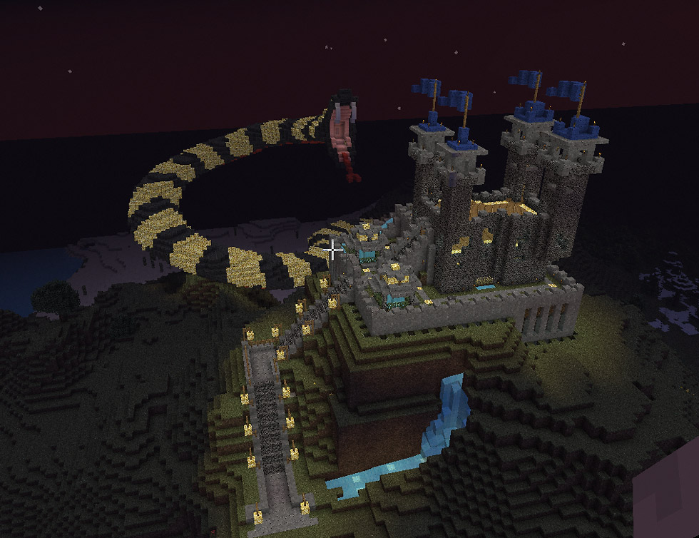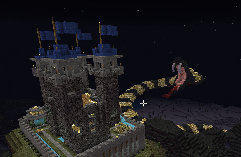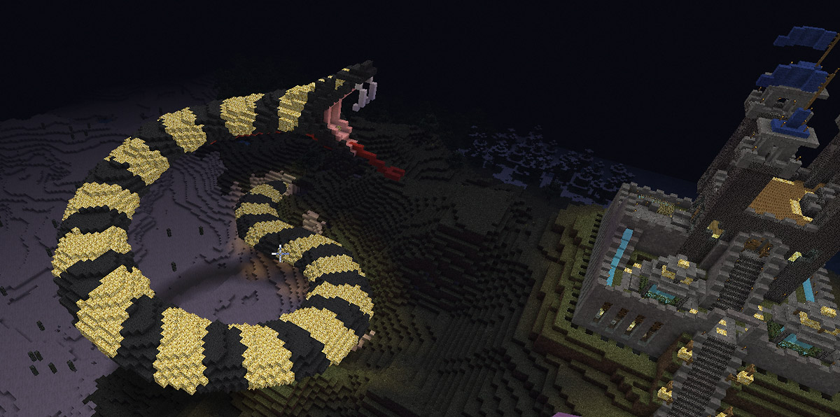 In einem früheren Chatsystem “Trilian” philosophierten einige über den Bau einer angreifenden Schlange. Medusa hatte wohl schon einmal eine Schlange gebaut. Meine Idee war es: Die Schlange leuchten zu lassen und dass diese eine Burg angreift. Genügend Ressourcen “glowstones” waren auf unserem Server vorhanden und durch unser riesiges unterirdisches Lagergebäude waren Materialien das kleinste Problem. Medusa und sein fast 10 Mann starkes Team nahmen die Herausforderung auf dem abc-gamers Server an. Die Arbeiten erwiesen sich schwieriger als gedacht, denn unser Server lief nicht im Weichei-Modus. Jede nicht vernünftig ausgeleuchtete Umgebung wurde mit einem Creeper bestraft und in der Nacht kamen die Endermänner noch dazu. Der Bau dieser Szenerie dauerte fast vier Wochen mithilfe des Medusa-Teams.